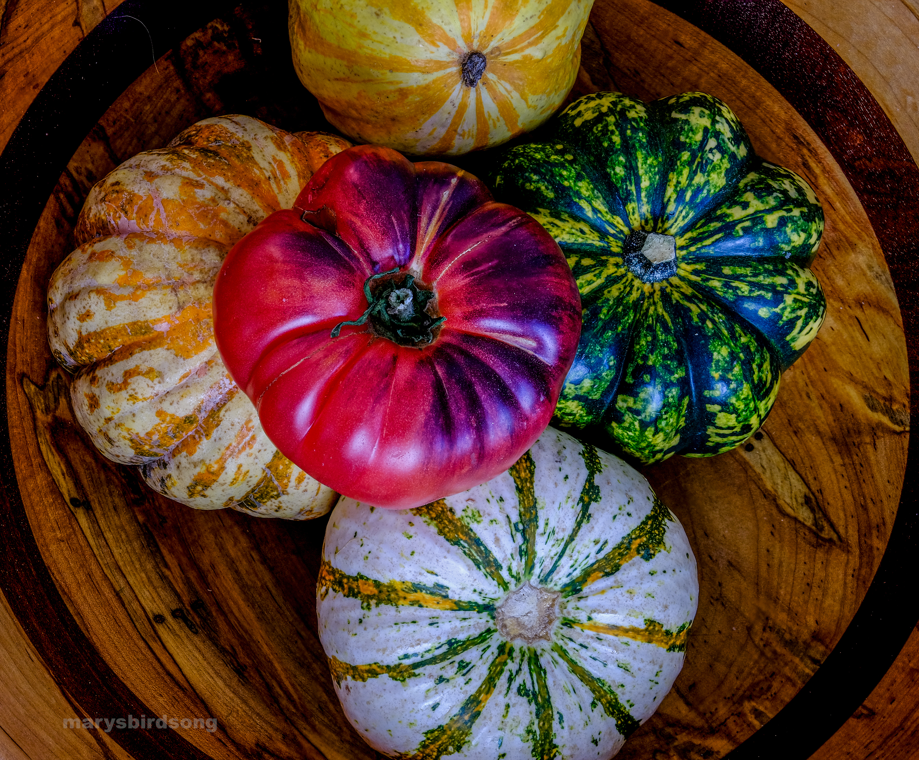 Gourds and a tomato Posted on November 4, 2023 by marysbirdsong Gourds and a tomato ShareShare Click to email a link to a friend (Opens in new window) Email Click to share on Facebook (Opens in new window) Facebook Click to share on X (Opens in new window) X Like Loading...